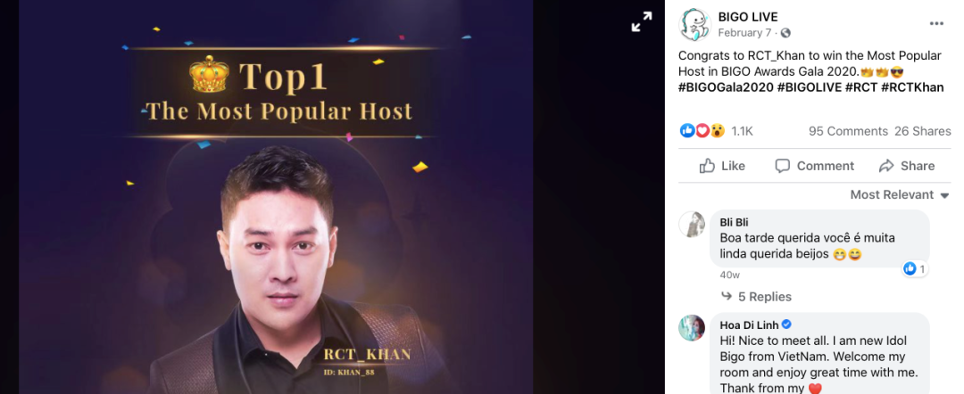 网红RCT_Khan获得欢聚海外直播平台Bigo Live的最受欢迎主播