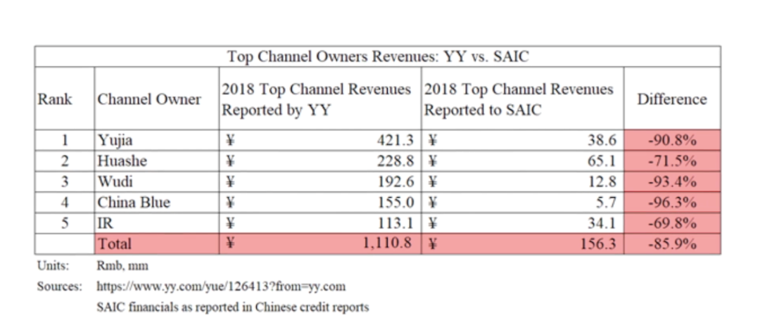 其三,质疑管理主播的公会也参与造假。根据对比欢聚时代的财报和五大公会的企业征信报告,浑水质疑,2018年这些公会的收入不到欢聚时代公布的15%。