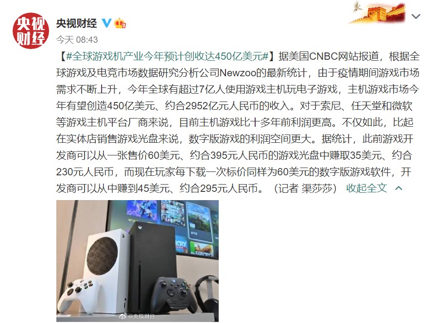 据央视财经今日消息,美国CNBC网站援引全球游戏及电竞市场数据研究分析公司Newzoo的最新统计数据称,疫情期间,游戏市场需求持续火热。截至目前为止,全球有超过7亿人使用游戏主机玩游戏,主机游戏市场今年有望创造450亿美元、约合2952亿元人民币的收入。
