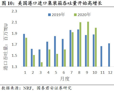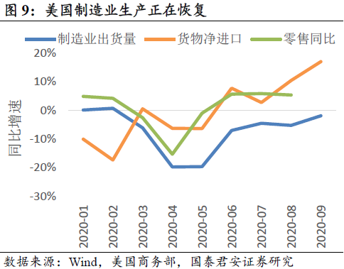 三季度欧美消费恢复,中国出口增速提升。卫生事件期间的大量补贴,使居民可支配收入同比增长,推动消费复苏,6月份开始美日欧零售恢复增长。三季度中国出口增速提高,对美国出口增速明显提升。