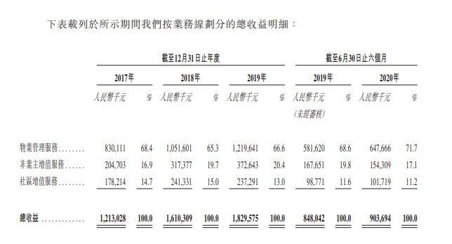 此外,物业管理服务为公司营收主要来源,2017年至2020年上半年,物业管理服务方面营收分别占到公司总营收的68.4%、65.3%、66.6%以及71.7%。
