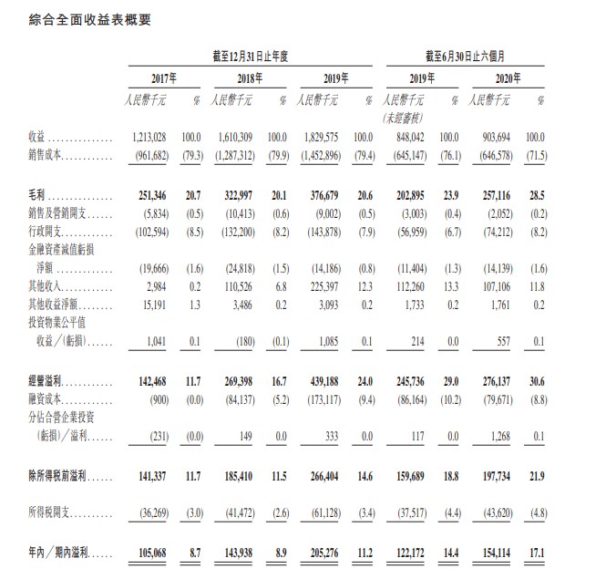 2017年至截至2020 年6月30日止六个月的营收分别为12.13亿元、16.1亿元、18.3亿元以及9.04亿元。