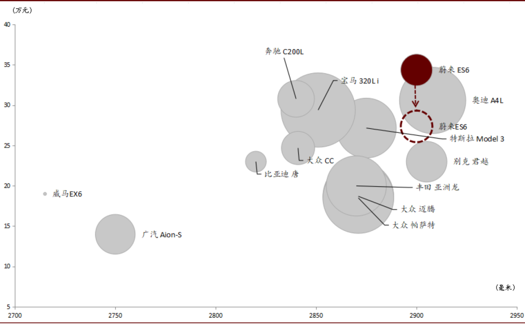 “车电分离”带来裸车价格直接下探,挤占中端及入门级高端市场。蔚来汽车已于2020年8月推出Baas(Battery as a Service)服务,即消费者可以只购买裸车(无电池),后期每月支付一定费用以租赁电池,这使得购买价格直接下降,有利于采购平价。Baas方案可使得ES6补贴后裸车价格直接下探至27.4万元,我们认为ES6将挤占部分20-30万元中端市场份额(特斯拉 model 3、奥迪 A4L、别克君越、大众迈腾、丰田亚洲龙);可使得ES8裸车价格直接下探至38万元,我们认为ES8将以高性价比、长轴距优势挤占部分豪华车市场(奥迪Q7、奔驰GLE、沃尔沃XC90)。