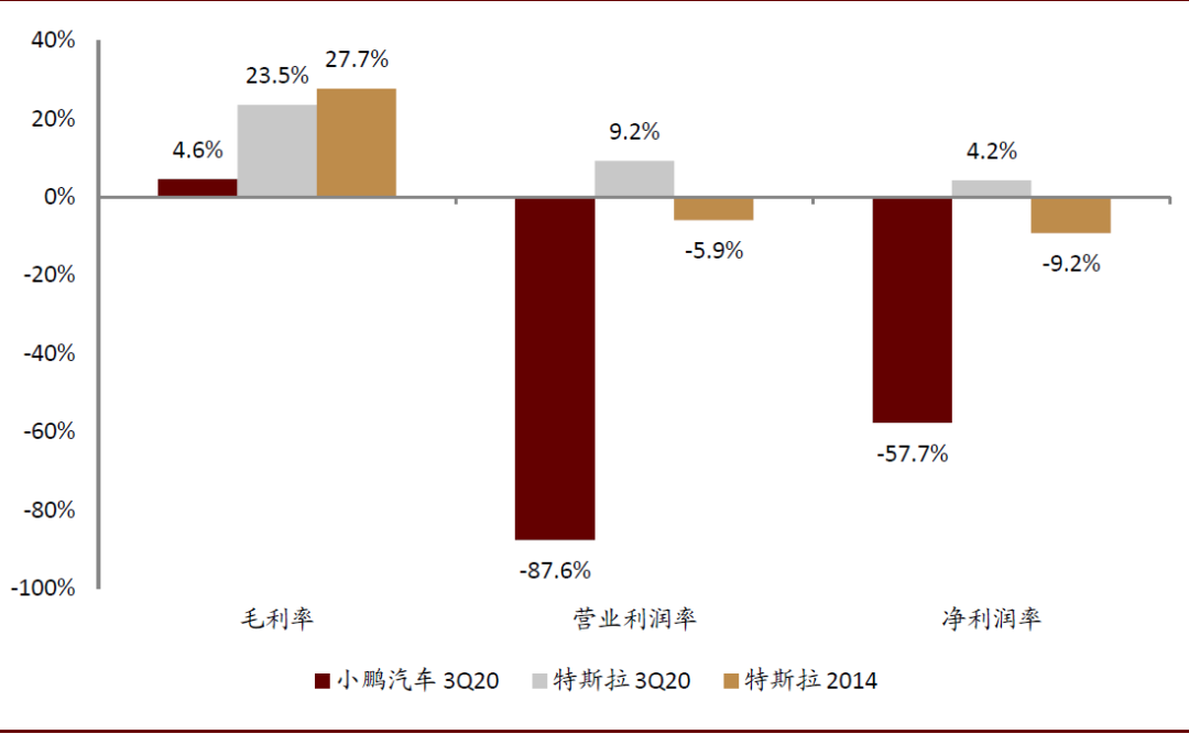特斯拉不断降价为P7定价带来压力,性价比与毛利率不能两全。目前小鹏汽车P7补贴后售价为22.99万元-36.69万元,与降价后的国产特斯拉Model 3的价差仅为2万元,但从盈利能力来看,由于小鹏汽车销量规模较小,零部件等议价能力有限,在追求高性价比的定价后,小鹏汽车与特斯拉目前的毛利率、2014年刚开始放量时特斯拉的毛利率均存在较大差距,2020年三季度小鹏汽车毛利率为4.6%,而特斯拉2014年、2020年三季度的毛利率分别达到27.7%、23.5%。