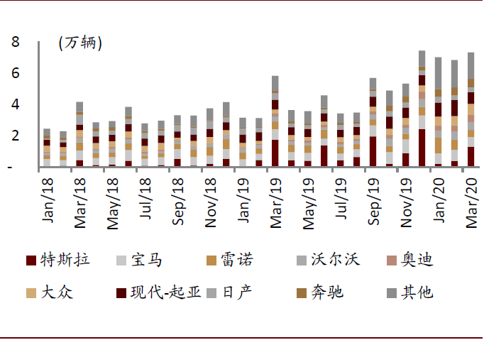 考虑到车牌价格,特斯拉在限牌城市将直接与中端品牌竞争。考虑国内限牌城市对新能源车的上牌政策,特斯拉则体现出了高性价比:以上海为例,Model 3补贴后售价约为25万元,上海燃油车车牌拍卖价格约9万元,扣除燃油车车牌成本,特斯拉裸车价格则等同于价格约为16万元的燃油车。从上牌量数据来看,特斯拉的销量集中分布在发达及限牌城市,我们认为限牌城市新能源汽车牌照成本较低、发达城市和限购城市新能源汽车充电桩铺设较广均是主要原因。因此我们认为在限牌城市中,特斯拉将直接影响大众、丰田等中端品牌的市场。