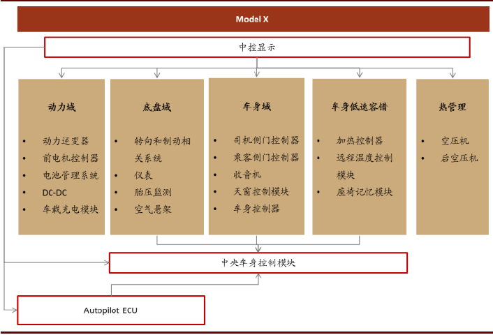 软件定义汽车,突破性模块整合。特斯拉在电子电器架构方面不断整合,Model X通过中央车身控制系统对动力域、底盘域、车身域等进行跨域模块整合,Model 3则全面模块化,分为左侧车身控制模块、中央计算模块和右侧车身控制模块,更加有效地节省算力冗余,也更便于OTA升级。软件定义汽车带来的功能的重分配,实质就是不断把功能从供应商手中拿回来自行开发的过程,提升灵活性,降低采购成本。