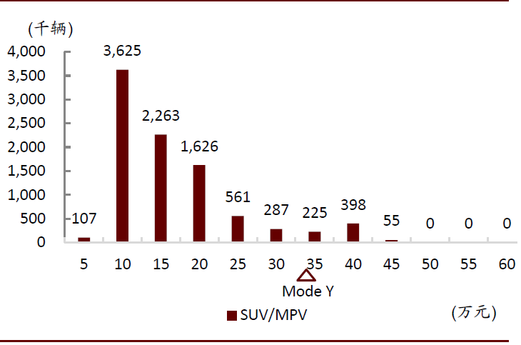 中国SUV市场规模呈“U”型分布,高端SUV亦有市场。美国SUV市场主要集中在单车价格2.5-3.5万美金的市场,随着价格的上升,销量和市场规模均呈现下降趋势。中国SUV市场10-20万元车型占据主流,但与中国轿车市场类似,中国SUV市场规模也呈“U”型分布,高端SUV也有相应市场。