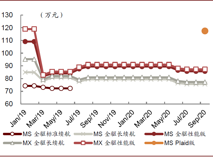 展望2021年:是以价换量的动态过程。历史上特斯拉售价被视作为在手订单的调节工具,价格调节频繁。2019年至今,大多车型价格都调整了三次或以上。特斯拉各车型的售价长期来看是逐渐下降的过程,在新能源汽车退坡的环境下,价格下调更显示出其降本控费的能力,我们认为以价换量或成为特斯拉在中国市场近期的策略。