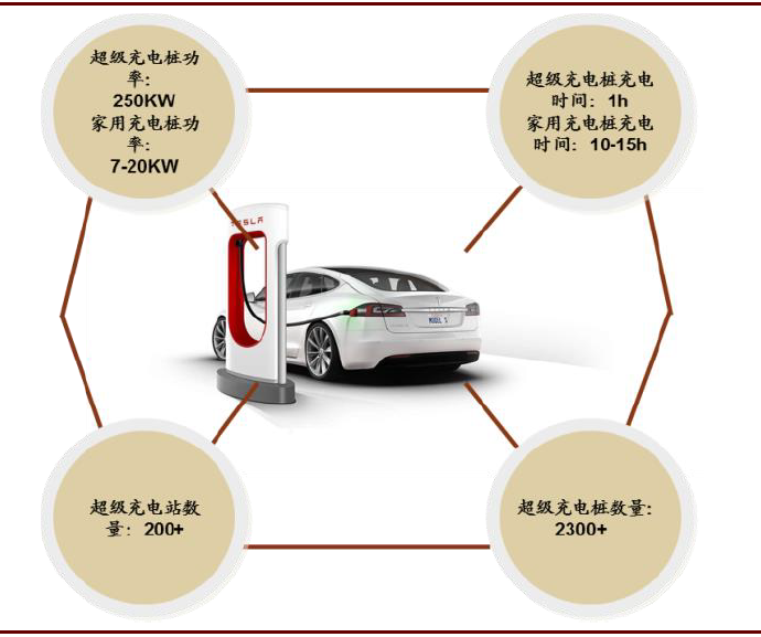 推广超级充电技术。特斯拉超级充电桩V3版本功率高达250KW,充电效率是家用充电桩的10-15倍,相比于其他新能源汽车充电桩也具有显著优势。例如,一辆Model 3长续航版可以在通过V3超级充电桩充电5分钟后续航120公里。同时,特斯拉正加快超级充电站的扩张和超级充电桩的铺设,目前国内已建立超过200个超级充电站,铺设超级充电桩超过2300个。