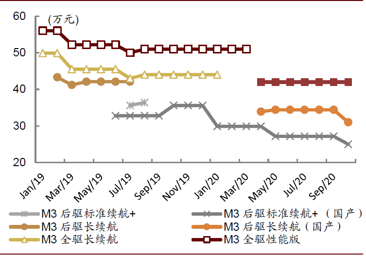 设计创新,带动物料成本降低。特斯拉在诸多设计细节上有较大的工程创新,例如Model Y一体化底盘、高度集成的热泵系统等,均有助于实现设计降本。在降低成本的基础上,特斯拉多次下调售价,不断将福利让渡给消费者,2019年至今,中国市场Model 3单车售价从40-50万元不断下调至25万元附近,价格竞争力显著提升。