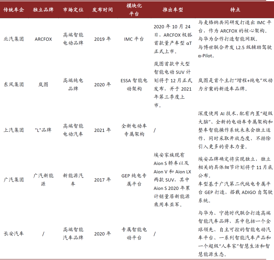 阶段II:传统车企认识到新能源独立品牌的重要性,出现一批源自传统车企的品牌拆分运营,参与第二阶段竞争。我们认为这一阶段的特征是,传统车企的分拆品牌依托于较强的传统车现金牛业务,财务状况较好,不存在较大资金链断裂风险。我们预计这些品牌将利用其资金优势,力图做出一定的品牌区分度。