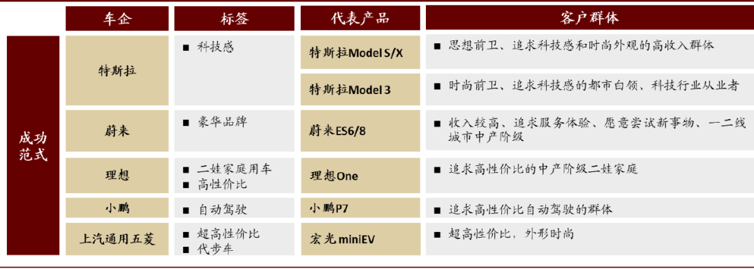 我们梳理了在第一阶段发展较好的新能源车企,各车企均拥有其特色标签:特斯拉以科技感为标签、蔚来以豪华品牌为标签、理想以高性价比二娃家庭用车(大型SUV)为标签、小鹏以高性价比的自动驾驶为标签、上汽通用五菱以超高性价比代步车为标签。而失败的车企则产品千篇一律、目标客户模糊。