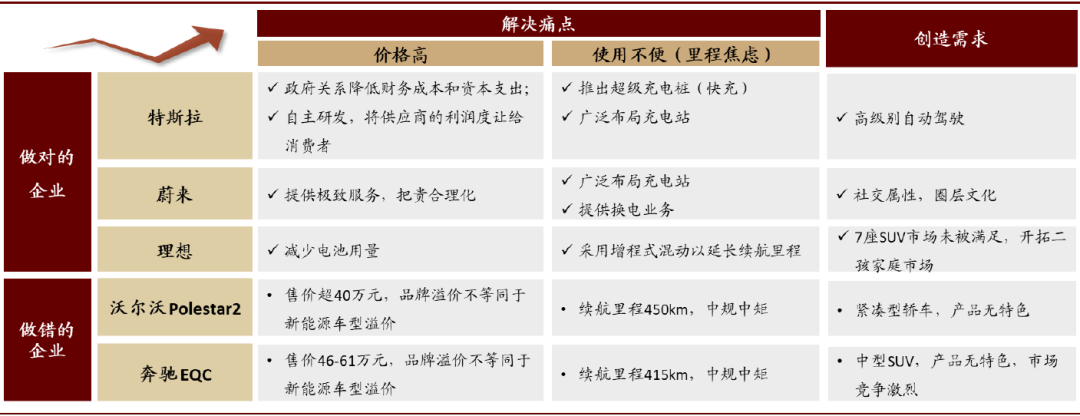 拥有鲜明标签是成功的基础,在此之上还需要解决痛点、创造需求。新能源车的痛点主要有二:1)相较于燃油车来说价格偏好高,性价比弱;2)充电时间长、充电不够便利带来的里程焦虑。成功的企业通过各自不同的手段解决或缓和了以上痛点。在解决痛点的同时,成功的企业也根据其特色标签创造和扩展了需求。
