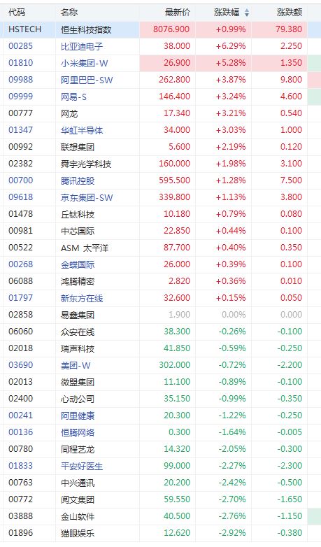 小米集团涨超5%,阿里巴巴、网龙、网易、华虹半导体涨超3%,联想集团涨超2%。