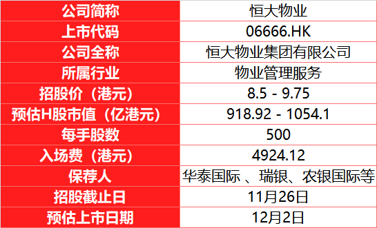 恒大物业招股区间为每股8.50港元-9.75港元,每手500股,一手入场费4924港元,预期将于12月2日上市。本次联席保荐人华泰国际、瑞银、农银国际、建银国际、中信证券和海通国际。