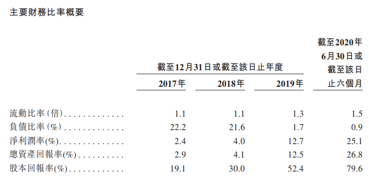 从主要财务比率来看,恒大物业的流动性呈现持续改善的趋势,负债比率从2017年的22.2降至2020上半年的0.9,其净利润率也从2019年的2.4%增长至最新的25.1%。