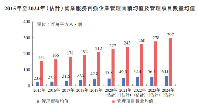 物业服务百强企业管理项目数量均值由截至2015年的154个增至截至2019年的212个,复合年增长率约为8.3%。