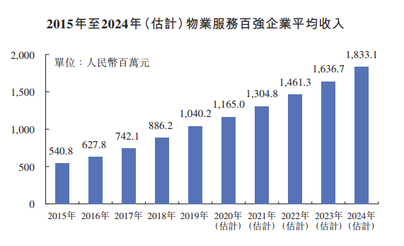 由于在管物业的建筑面积及数目增长,物业服务百强企业的营业收入均值由2015年的约人民币5.41亿元增至2019年的约人民币10.4亿元,复合年增长率约为17.8%。