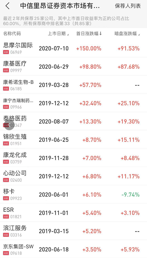 根据资料,中信里昂最近2年共保荐25家公司,其中上市首日收益率为正的公司占比为60%,所有保荐商中排名第33,其中包括思摩尔国际、康基医疗、康希诺生物-B、康宁杰瑞制药、泰格医药等大牛股。可供投资者们参考。