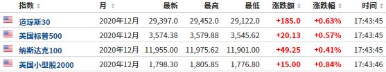 阿斯利康周一表示,疫苗AZD1222对新冠病毒有效,达到主要疗效终点,其平均有效性达到70%。阿斯利康还称,一剂疫苗疗程的有效性可达90%。受阿斯利康疫苗利好消息影响,美股股指期货走高,道指期货涨0.63%,标普500指数期货与纳指期货涨0.57%。