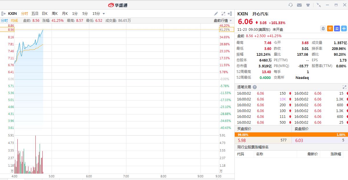 开心汽车盘前续涨逾40%,上个交易日大升约1倍。此前,开心汽车宣布,公司于11月3日与海淘车有限公司签署了约束性投资意向书,并对管理层进行人事调整。