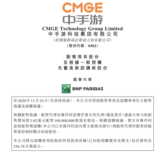 中手游:按每股3.02港元配售1.8亿股现有股份