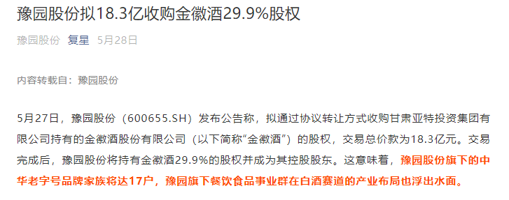 在入主金徽酒之初,豫园股份曾在复星公众号上发表了一篇文章,直言“豫园旗下餐饮食品事业群在白酒赛道的产业布局浮出水面。”公司相关负责人对野马财经(微信公号:ymcj8686)表示,“酒业布局有望与豫园股份已有的餐饮、食品、商业与文创等多个产业集群形成良好的协同效应,并加速放大旗下餐饮食品业务群的规模效应。”