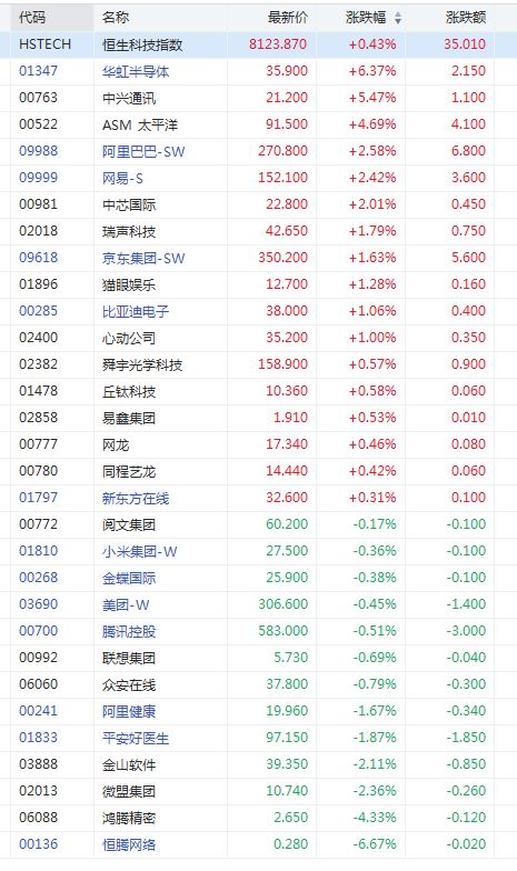 华虹半导体涨超6%,领涨指数成分股;中兴通讯涨超5%,ASM太平洋涨超4%,阿里巴巴、网易、中芯国际涨超2%,瑞声科技、京东集团、猫眼娱乐涨超1%。
