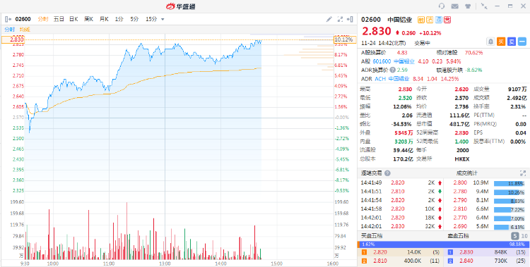 中国铝业昨日大涨超13%,今日继续获资金追捧。截至发稿,涨10.12%,报2.83港元,成交额2.492亿港元。