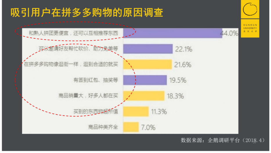 有将近一半的拼多多用户认为,在拼多多上购物可以和熟人拼团更便宜,还可以互相推荐。还有大量的人认为在拼多多上购物就像逛街一样,看到合适的就买,还可以邀请好友一起参与拼单、砍价。
