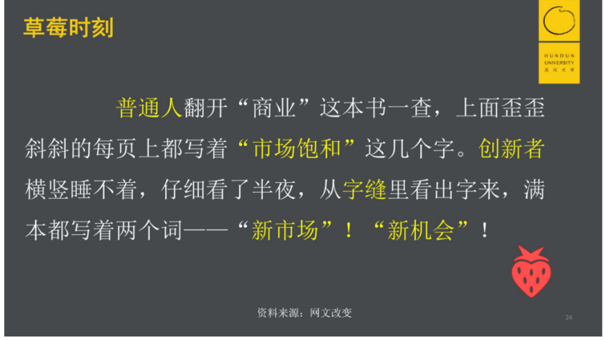借用一位网友改编鲁迅先生的一句话——普通人翻开商业这本书,每一页上都写着“市场饱和”几个字。而创新者横竖睡不着,仔细看了半夜,从字缝里看出来,满本都写着“新市场”和“新机会”。