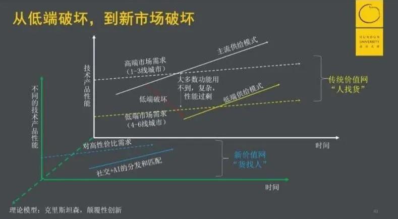 所以我们看到,拼多多在第二步创新的时候,用了一个非常典型的低端破坏模式。但当它走到第三步的时候,我们发现它的价值维度又有了新的衍生——用“社交+AI”的分发和匹配机制,满足各个层面消费者“对高性价比的需求”,这是我们认为拼多多走到目前为止最核心的一个创新。