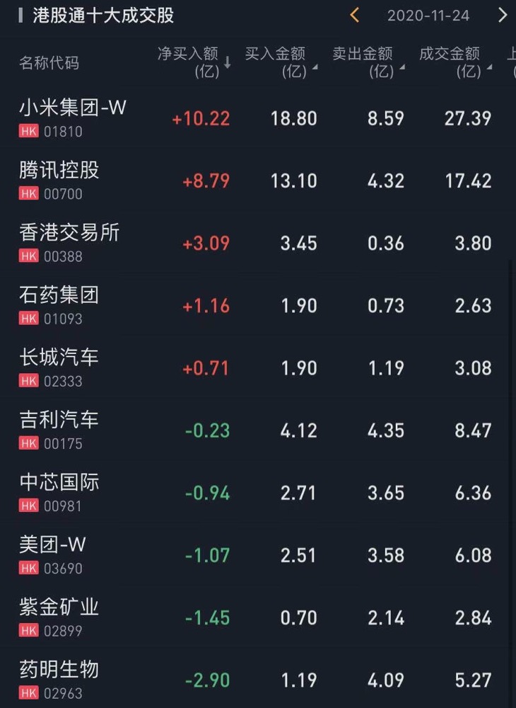 个股方面,今日南下资金净买入小米集团-W10.22亿港元,为今日买入之最。此外,南下资金净买入腾讯控股8.79亿港元,净买入香港交易所3.09亿港元。此外,南下资金净卖出药明生物2.90亿港元。