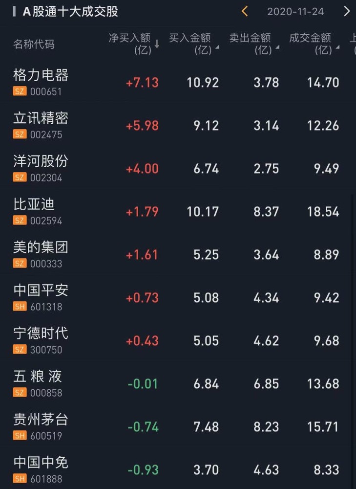 北上资金今日净买入格力电器7.13亿元,净买入立讯精密5.98亿元,净买入洋河股份4亿元。此外,北上资金净卖出中国中免0.93亿元,为今日抛售之最。