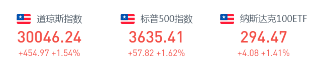 截至收盘,道琼斯指数涨454.97点,涨幅1.54%,报30046.24点;标普500指数涨57.61点,涨幅1.61%,报3635.20点;纳斯达克综合指数涨156.15点,涨幅1.31%,报12036.79点。