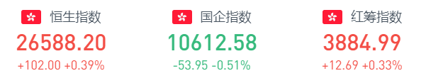 周二,恒生指数开盘涨0.54%,盘初急跌后震荡回升。截至收盘,恒生指数涨102点或0.39%,报26588.2点,全日成交额达1377.7亿。国企指数跌0.51%,报10612.58点,红筹指数涨0.33%,报3884.99点。