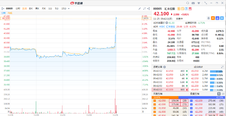 11月25日消息,香港本地银行股集体走高,汇丰控股大涨超5%,报价42.1港元,市值8711亿港元,平安入股以来公司股价大涨49%。