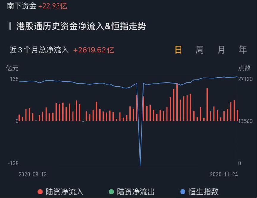 南下资金今日净流入港股22.93亿港元,流入规模较昨日继续下滑约10亿港元。
