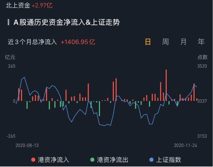 北上资金今日净流入A股2.97亿元,港资加仓A股情绪继续消极,但仍维持正流入。