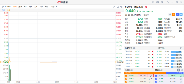 濠江机电昨天处于横盘,且多成交多为4.47港元,但午后迎来放量成交,全天成交8934万股,尾盘5分钟,濠江机电大单出货1400万股,尾盘集合竞价出货170万股。庄家集中出货。今日开盘,濠江机电跌14.91%,报3.71港元。盘初,公司遭洗仓,股价雪崩,截至发稿,濠江机电跌85%,股价不足1港元,市值3.2亿港元