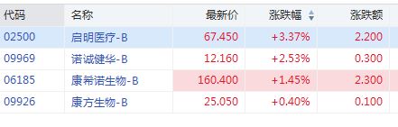未有盈利生科技公司纳入港股通在即,启明医疗-B涨超3%,诺诚健华-B涨超2%,康希诺生物-B涨超1%,康方生物-B微涨。