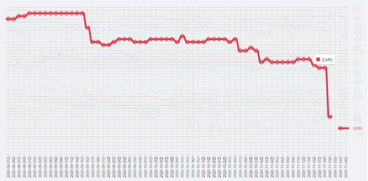另外,生物信息公司Illumina(ILMN.O)一直是ARK的重仓股。据最新披露的13F文件显示,截至9月30日,ARK持有Illumina 978,663股股份,市值约3亿美元。今年9月,有市场消息称,Illumina正洽谈以超过80亿美元的价格收购癌症筛查公司Grail。消息公布后,Illumina当日收盘大跌8.6%。据报道,在消息传出后,ARK也减持了7.5%的股份。9月下旬,Illumina的最低点到了260.42美元,为4月以来最低。此后,ARK也一直在减持Illumina。就在昨日(24日),ARKG减持该公司32,368股股份,完成清仓。