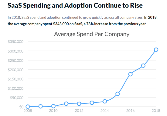 根据Blissfully的数据,从2008年到2018年,美国企业的平均SaaS开销从0增长到接近30万美金,光是2018年就增长了78%。SaaS不是今年卫生事件才强,而是一直都很强。整个社会上云的数字化浪潮,是它们强大的基础。