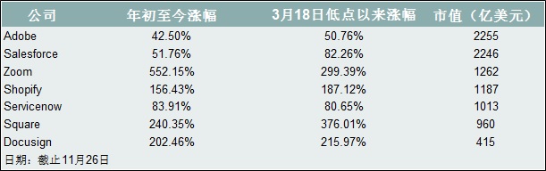 卫生事件是SaaS产业发展的重大拐点,“宅经济”推动“云经济”迅速发展。美股中,SaaS行业牛股倍出。视频会议领域的Zoom(ZM.US)今年涨幅超500%,不少公司市值猛涨,板块内除了两家龙头Adobe(ADBE.US)和Salesfroce(CRM.US)市值突破2000亿美元之外,多家公司市值站上千亿美元大关。