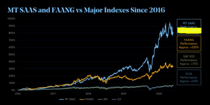 虽说FANNG基本是科技股代名词,但是过去四年里,FAANG综合涨幅只有330%,SaaS龙头股综合涨幅高达880%。