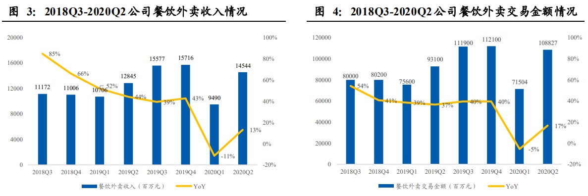 预计美团Q3外卖日均单量约3490万单(2019Q3 2684 万单,同比增长30%),同时假设AOV(平均每单金额)同比提升6%至48元(环比2020Q2 48.8元有所下滑),因此预计Q3外卖 GTV(平台交易金额)为1542亿元,同比增长37.8%。