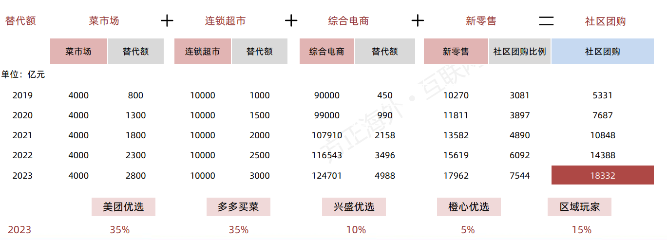 而方正证券也认为由于菜市场和连锁超市过去5年增长率基本为零,加上综合电商的9万亿GMV,这些会被社区团购抢去越来越多的份额,乃至部分替代。