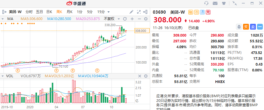 而在11月26日美团-W股价也在财报发布前迎来大涨,盘中涨幅最大一度达5%。这也是美团在此前市监局反垄断风暴后首次站回300港元上方,市值也重回1.8万亿港元。