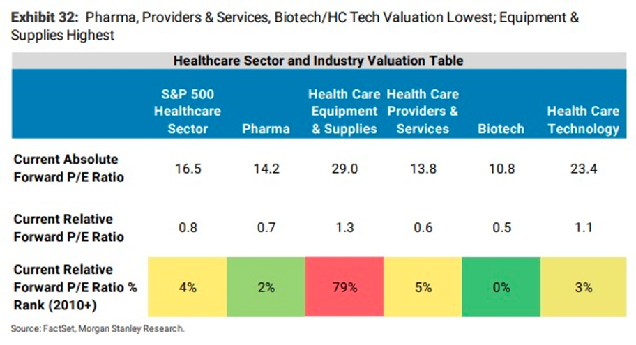 此外大摩认为医药股也将跑赢大盘,原因在于制药、医疗保健服务供应商、生物科技、医疗保险技术等板块的相对估值都处于2010年的低位,目前仅有医疗器械板块相对估值较高。
