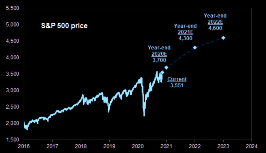近日,高盛美股策略师David Kostin对2021年美股表现进行了预测:2020年底,标普500指数将站上3700点;2021年底,标普500指数将站上4300点,意味着全年升幅超过16%;2022年底,标普500指数将站上4600点。
